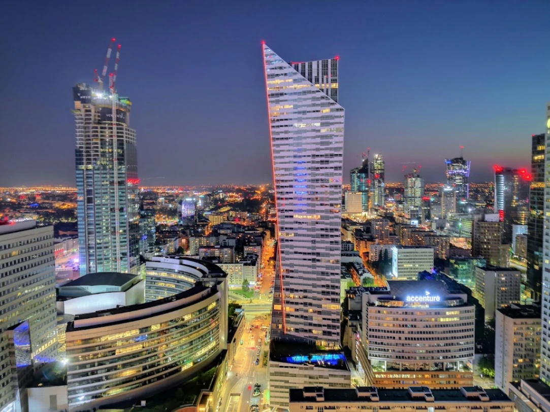 Located on the 21st floor with skyline panoramas, this luxury apartment offers modern decor, fast WiFi, workspace, and direct access to Złote Tarasy.